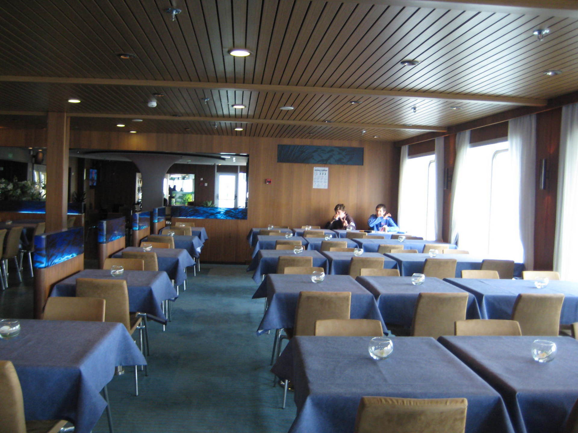 Wir waren verwundert, dass wir kaum einen Menschen zu Gesicht bekamen. Das erklärte sich dadurch, dass die Fahrer alle die Überfahrt mit Kabine gebucht und sich aufs Ohr gehauen hatten. Zum Abendessen erschienen sie dann so nach und nach. D.h. tagsüber hatten wir das Schiff für uns alleine.
