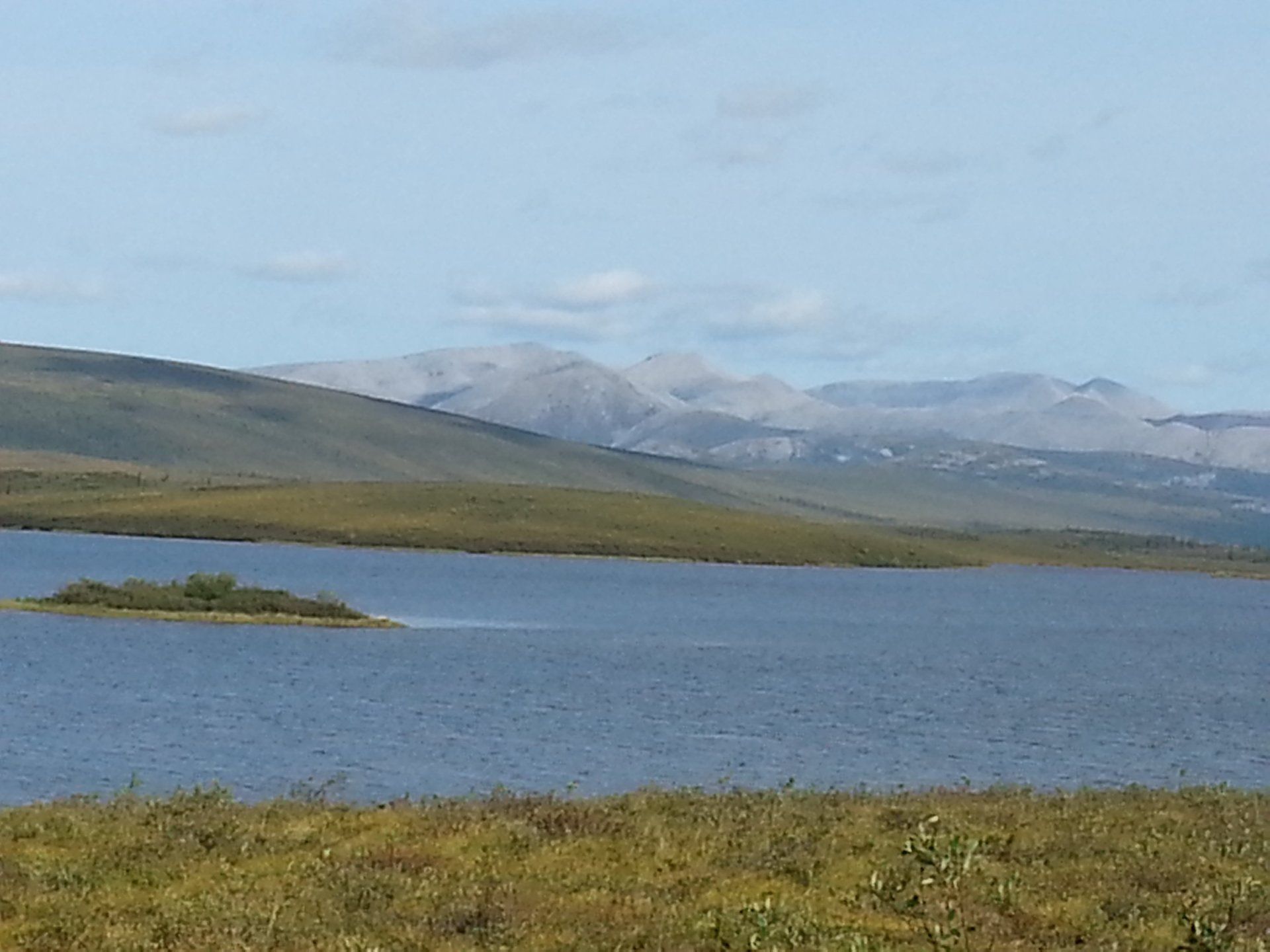 Unterwegs sehen wir mehrere Pingos. Diese Hügel entstehen folgendermaßen: Auf Permafrostboden befindet sich ungefrorener Boden und darüber ein See. Wenn das Wasser aus dem See zufällig zum Teil abläuft und ein Rest übrig bleibt, entsteht zwischen dem Wasser und dem ungefrorenen Boden neuer Permafrostboden. Aus dem Wasser des Sees entsteht dann das Pingoeis, umschlossen von Permafrostboden. Das gefrorene Eis beginnt zu wachsen und sich nach oben zu drücken mitsamt dem darüber befindlichen Permafrostboden. Der Hügel ist entstanden.