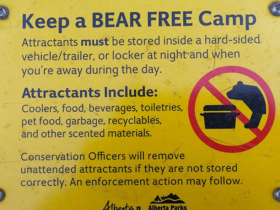 Hier wird vor Grizzlys gewarnt. Aufkleber auf unserem Tisch:
